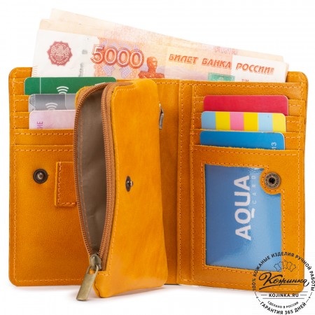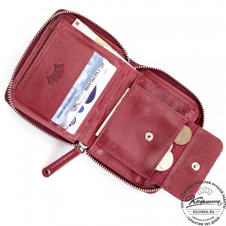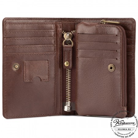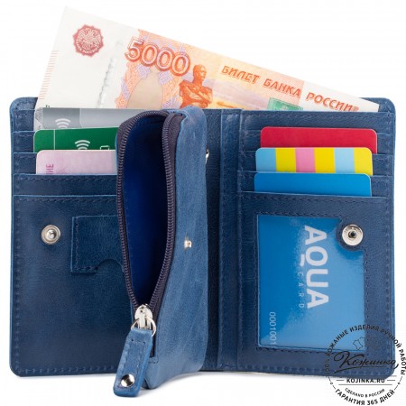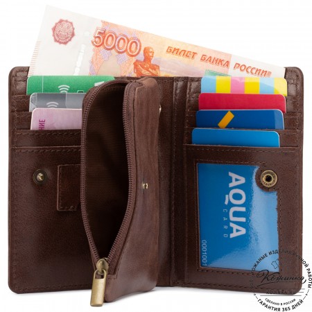 Эта модель очень функциональна - множество отделений позволяет удобно расположить большое количество кредитных карт и купюр, а также водительское удостоверение. Дополнительный отсек для мелочи. Портмоне закрывается на язычок с кнопкой.