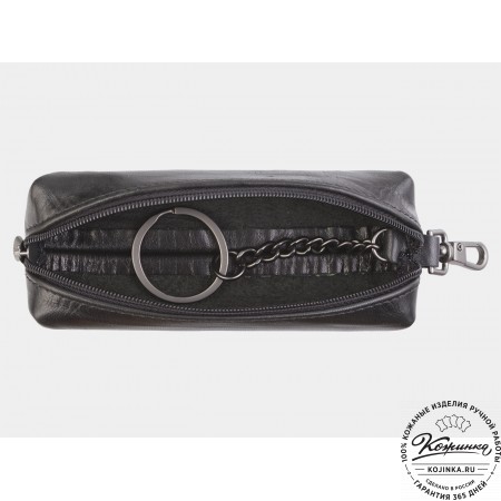Закрывается ключница на молнию, внутри большое металлическое кольцо для ключей.