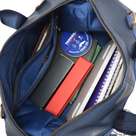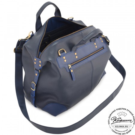 У сумки крепкие кожаные ручки и съемный кожаный плечевой ремень. Ремень имеет наплечник, регулируется по длине, крепится по бокам на карабины.