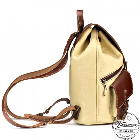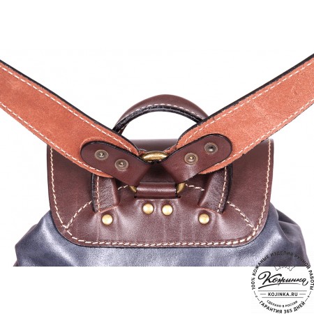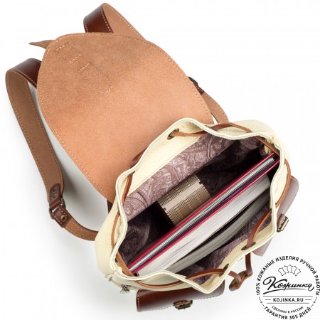 Внутри на задней стенке - карман на молнии для ценных вещей. Лямки у рюкзака мягкие, с двух сторон кожаные, регулируются по длине.