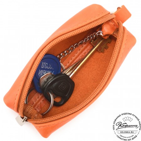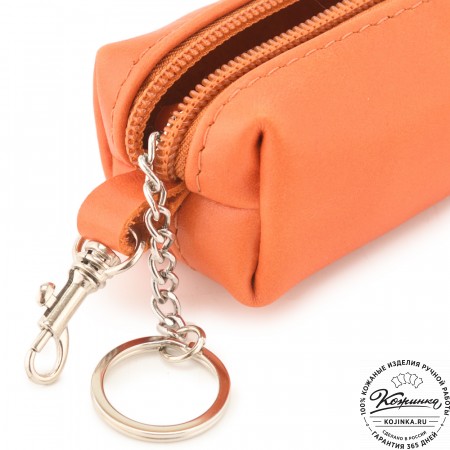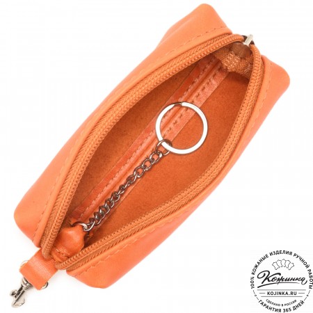 Внутри на кожаных петлях расположены металлическое кольцо для ключей и небольшой металлический карабин.